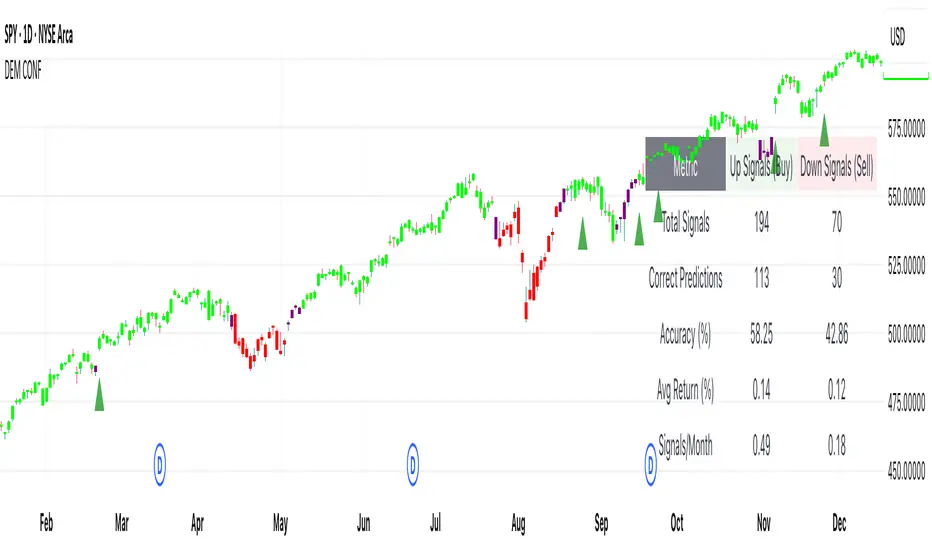 [DEM] Confirmation Signal (With Backtesting) is designed to generate buy and sell signals by combining Aroon oscillator analysis with Parabolic SAR positioning, smoothed EMA trend confirmation, and RSI filtering to create high-confidence trading opportunities. It also includes a comprehensive backtesting framework to evaluate the historical performance of these signals. The indicator overlays directly on the price chart, plotting signals and displaying performance statistics in a table while also coloring bars based on market conditions (green for bullish confirmation, red for bearish confirmation, purple for neutral). The strategy generates buy signals when the Aroon Up reaches 100% (new highs) combined with bullish trend confirmations, proper SAR positioning, RSI filters, and adequate time spacing between signals, while sell signals are triggered under opposite conditions, emphasizing signal quality over quantity through multiple confirmation layers and integrated backtesting metrics.