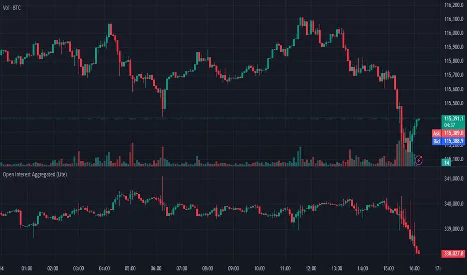 The Open Interest Aggregated (Lite) indicator consolidates open interest data across multiple major cryptocurrency exchanges into a single, easy-to-interpret visual. By aggregating open interest from Binance, Bybit, OKX, Bitget, and Coinbase (configurable per user preference), this indicator provides a holistic view of market positioning and trader sentiment in real time. It is designed for overlay-independent analysis, giving traders insight into derivatives market dynamics without cluttering price charts.