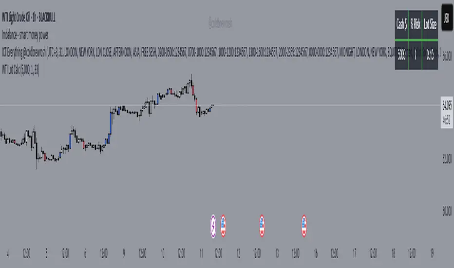 Automated Lot Size Calculation: Based on the inputs you provide, the script automatically calculates the lot size you should use for your trade. The calculation takes into account the balance you're willing to risk, the percentage of risk, and the stop loss size. This helps in managing risk by suggesting the amount of WTI Crude Oil you should trade (in lots) that aligns with your risk tolerance.