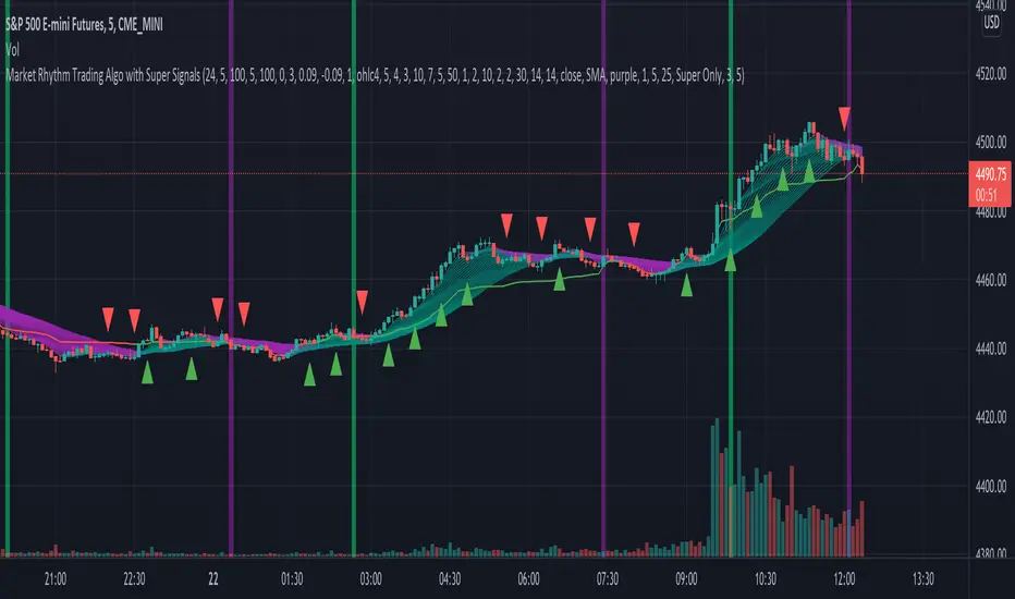Regular vs Super - Market Rhythm includes a set of regular signals, which are given on many price bars. Super signals are a combination of regular signals based on a length of bars you set. This is an effective way to clean up the chart and give more reliable buy and sell signals.