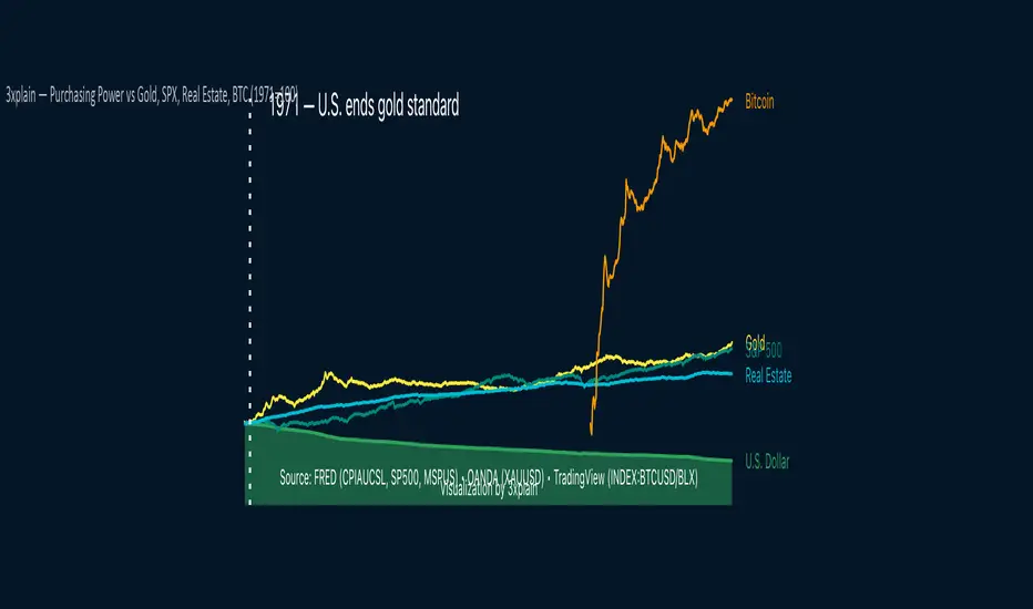 Visual comparison of U.S. dollar purchasing power versus major assets since 1971, when the U.S. ended the gold standard. Each asset is normalized to 100 in 1971, showing how real value has shifted across gold, real estate, stocks, and Bitcoin over time.