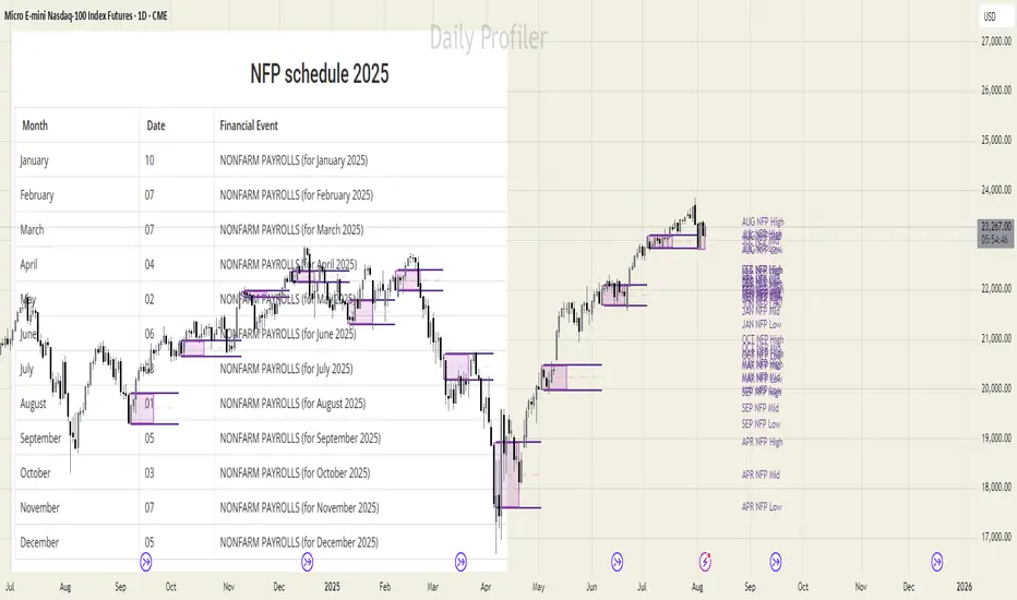 The Daily Profiler NFP is a comprehensive trading tool designed to track, visualize, and analyze price action during Non-Farm Payroll (NFP) release days. By capturing and displaying high, low, and mid-range levels from these significant market events, traders gain valuable support and resistance reference points that often influence future price movements.