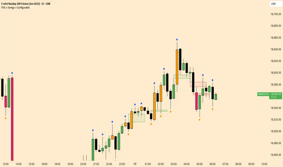 This Pine Script v5 indicator highlights Fair Value Gaps (FVGs), plots swing‑high and swing‑low pivots, and marks single breakouts above the last swing‑high or below the last swing‑low by recoloring the breakout candle. Every aspect—gap size, count limits, colors, and feature toggles—is exposed as an input so you can tailor it to your own workflow.