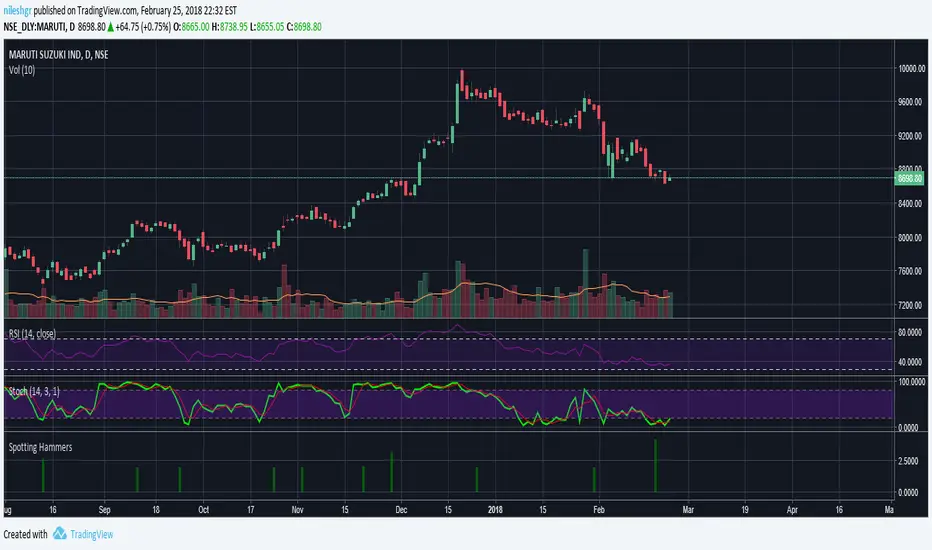 This script can be used to spot hammers on the charts, I try to avoid false positives by ignoring candles which have less than 0.25% price difference between open and close.