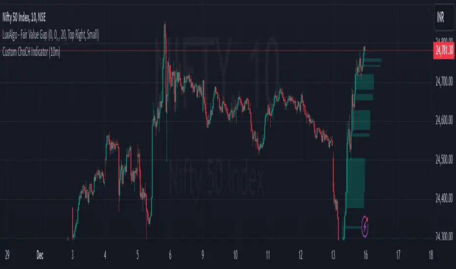 This custom Pine Script indicator identifies and marks Change of Character (ChoCH) events on a 10-minute chart. ChoCH is a price action concept that highlights potential market reversals. The indicator detects bullish and bearish Change of Character points and displays them as labels and background color highlights on the chart.