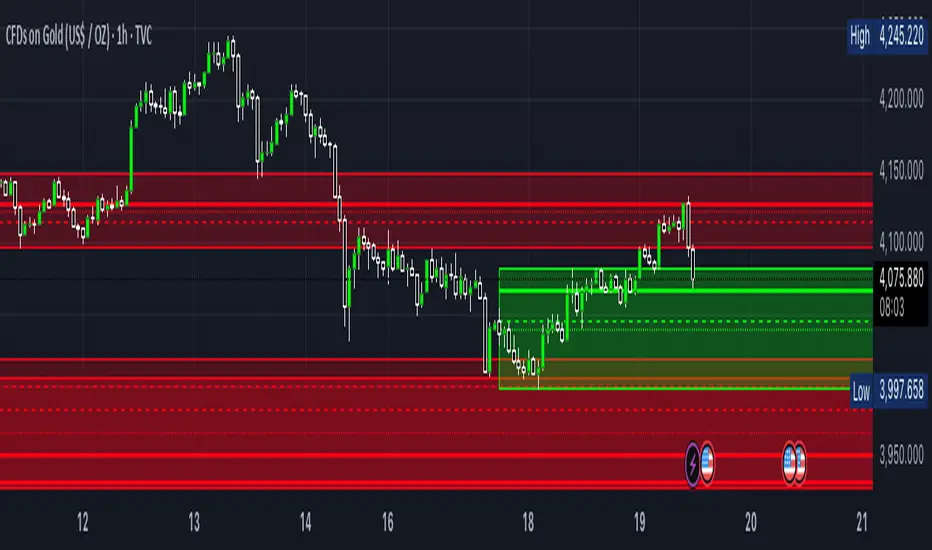 Holy Monday Indicator — Visualize the true Monday candle (UTC) to understand weekly market structure. The indicator displays high, low, open, close, and midpoint for the current Monday and the previous three Mondays, with shaded boxes, extended lines, and labeled midpoints. Color-coding reflects weekly bullish or bearish bias, with customizable colors and semi-transparent active Monday highlights. Ideal for spotting key liquidity zones, weekly bias, and potential reaction levels in Forex, Crypto, and Index markets.