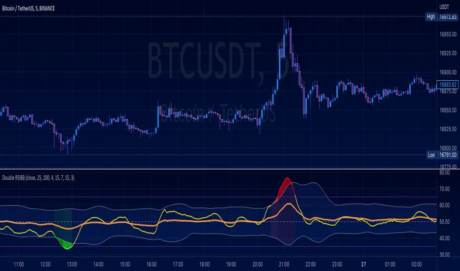 Double RSI with Bollinger bands adapted Bollinger bands to RSI not using overlay mode. It tries to filter fake signals while giving more good signals according to volatility even below overbought areas or above oversold areas. This way you can use greater values for RSI, like 25 and 100, increasing smoothness with less market noise.