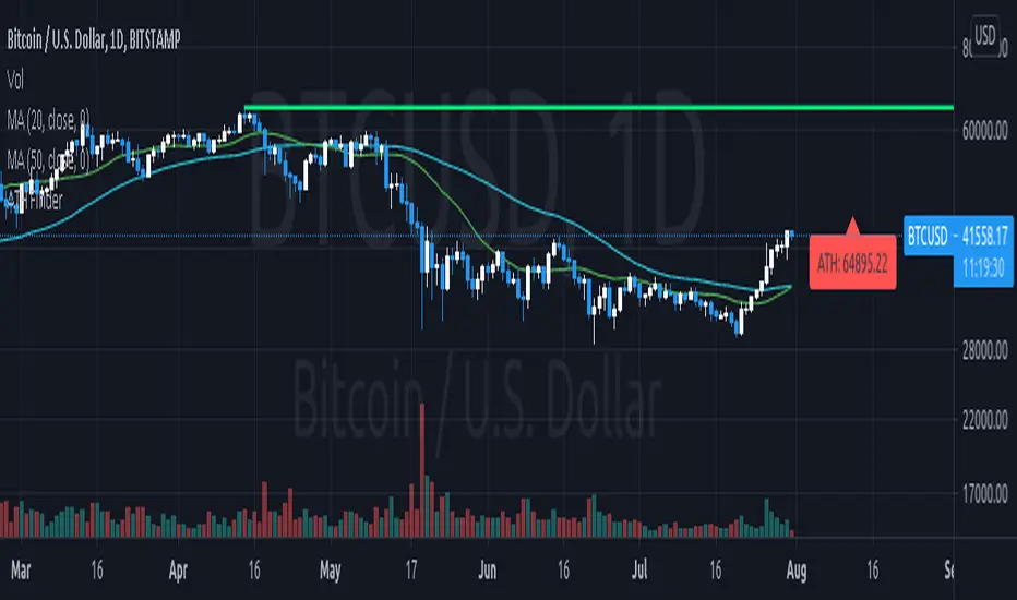 Find the all time high (ATH) and plot a horizontal line extended from the ATH out to the right. Script also produces a label near the current candle indicating location and value of the ATH. If the ATH is higher than the current candle's high the label will be red and pointing up to indicate the ATH is above the current candle. If that current candle's high is the ATH, the label is green and pointing at the current candle's high.
