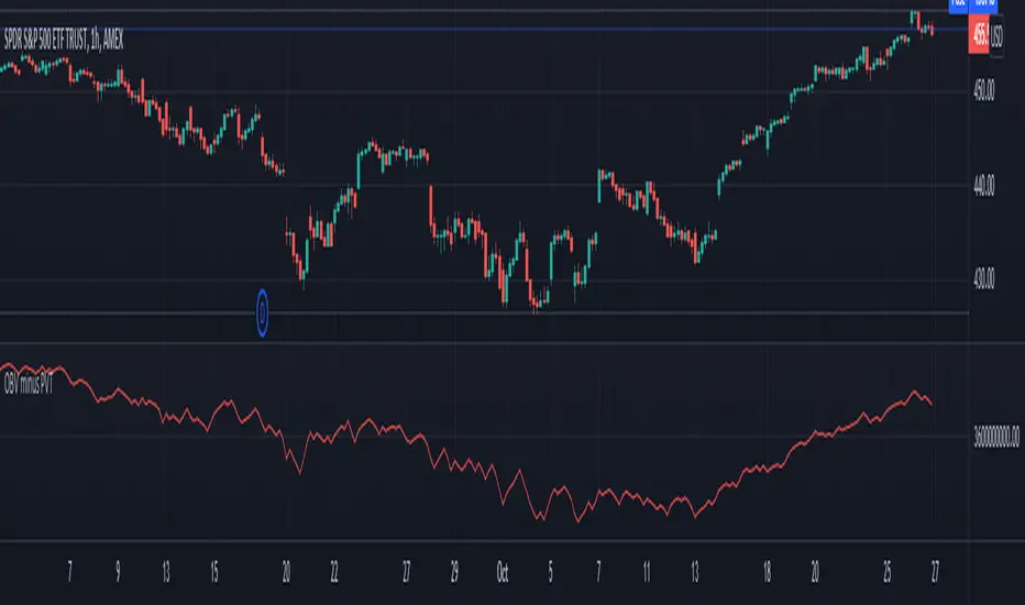 Using this knowledge, we are using the difference of OBV (the indicator with the entire amount added or subtracted), minus PVT (which subtracts a percent based on the percentage in price), this gives us a unique indicator which out puts a more whole picture of the two indicators. It shows us the difference of absolute volume minus relative volume based on the percent of close price. It allows us to see large shifts in volume BEFORE it happens.