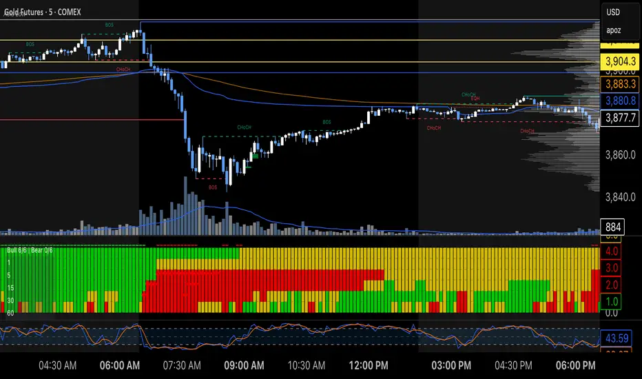 Turn your lower pane into a **multi-timeframe market bias dashboard**. This heatmap blends classic RSI momentum with a **hybrid Daily/Weekly MA-stack trend** and an **intraday impulse override** that flags fast moves *as they happen*. Clean, configurable, and built for real trading flow.