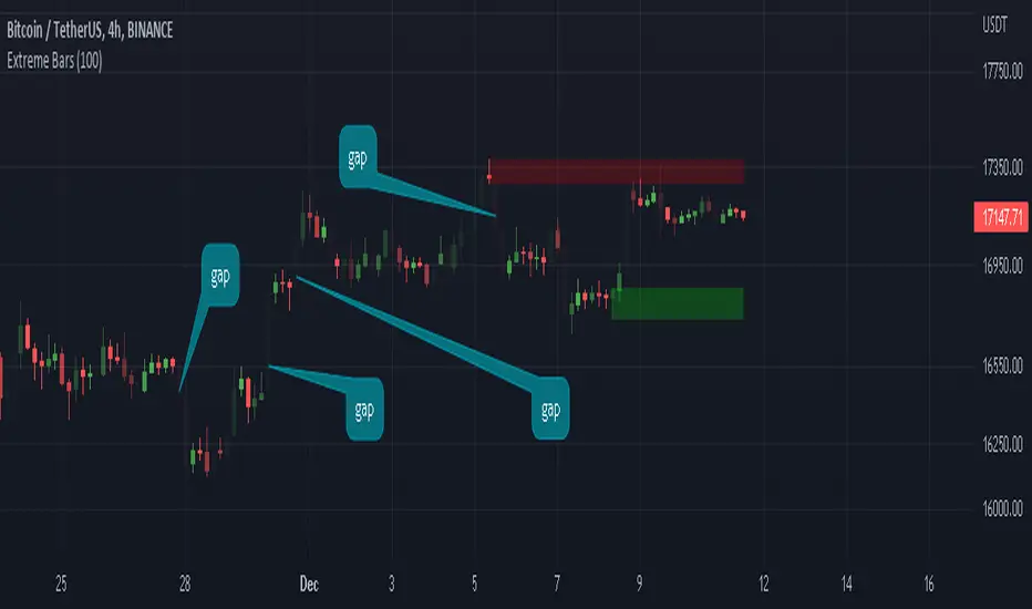 "Extreme Bars" is a simple but useful indicator that marks overbought and oversold candles. This indicator paints candles that fall far above the average red, and the candles that rise above the average green. Of course, they can change these colors if they want. "Extreme Bars" can be interpreted in many different ways. The starting points of colored candles can often be good support or resistance. In addition, it would be wise to close the positions opposite the colored candles and to maintain the positions compatible with the colored candles. It is also possible that the gaps formed by the colored candles will be closed in the future. The sensitivity of the indicator can be changed in the settings section.