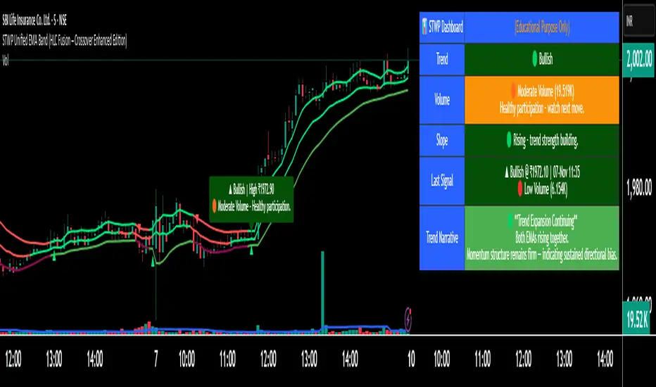 The STWP Unified EMA Band merges High–Low–Close fusion logic with crossover detection and volume context to offer a clear visual understanding of trend behavior.