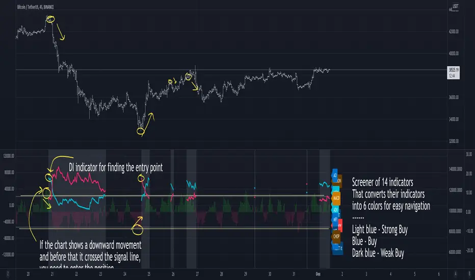 Also, at the expected moments of the appearance of a trend movement, a gray background lights up on the indicator and 2 colored lines of the DI indicator appear, the color of the bottom line indicates what kind of movement is brewing.