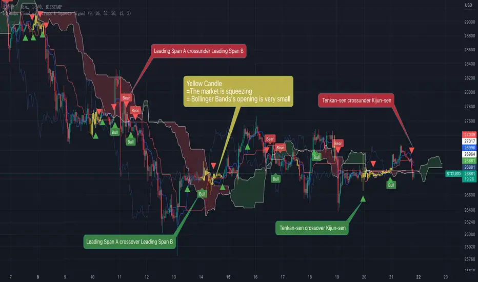 Ichimoku cloud is one of my favorite indicators, but the traditional Ichimoku cloud indicator does not add cross signals and squeeze signals, so I added them for it.