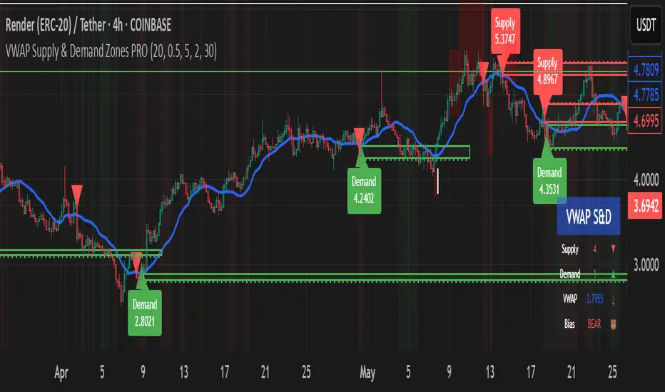 This indicator dynamically detects **supply and demand zones** using VWAP-based logic combined with **volume** and **momentum confirmation**. When price crosses VWAP with strength, it identifies the potential zone of excess demand (below VWAP) or supply (above VWAP), marking it visually with colored regions on the chart.