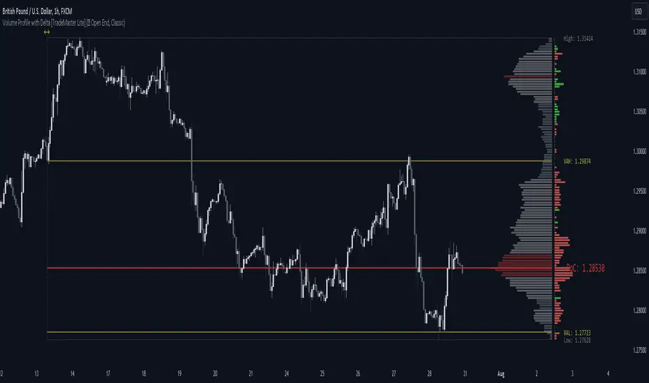 - Open End: displays the volume profile from a specific start date without a defined end, including real delta data. It provides an overview of the volume activity across all price levels of the examined period.