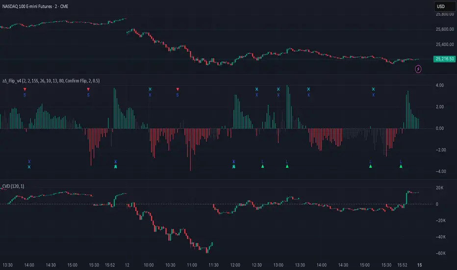 pure volume-delta momentum/participation tool. It computes a normalized (z-score style) volume delta oscillator (zΔ) on your chart and compares it to a higher-timeframe “bias” zΔ. When both timeframes agree, the histogram changes color and the script prints clear entry/exit markers.