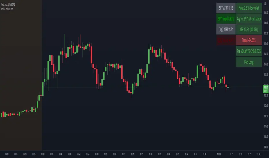 This indicator shows the most usefull informations about the current symbol and the two common indexes (SPY and QQQ) in a table, in the upper right corner of the graph.