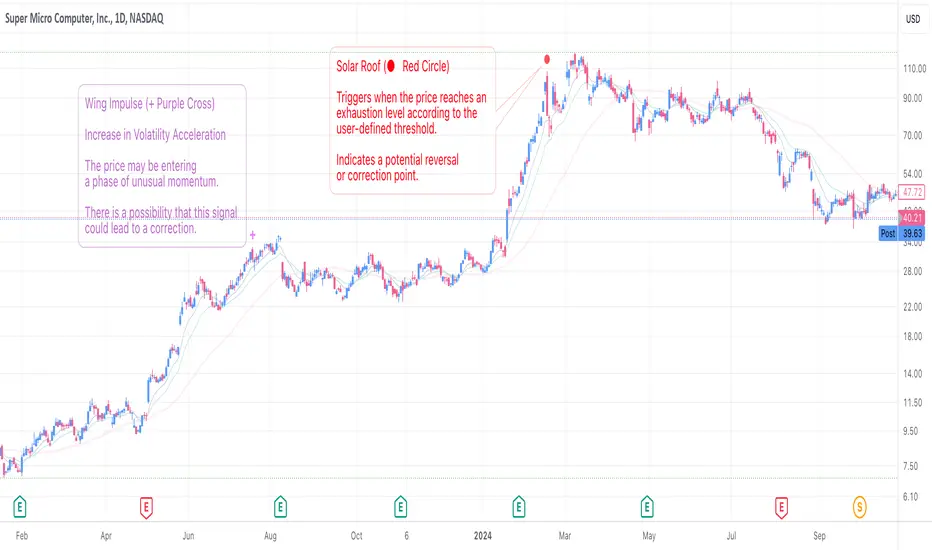 - Solar Roof (Red Circle): Appears when both the acceleration condition and the significant extension from the moving average condition are met. This indicates a possible exhaustion point or an imminent change in direction.