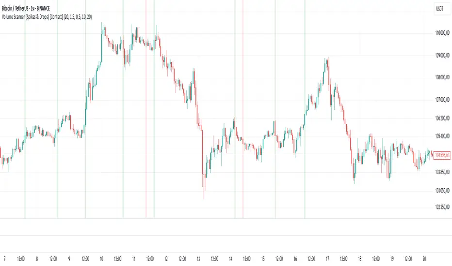 This indicator detects significant volume spikes or drops and optionally filters them by price context (local highs/lows).