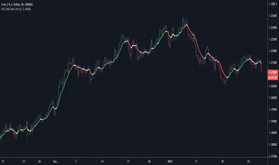 HLC MA is a simple Moving Average which compares x period close and hlc3 averages and takes the greater one. So, it's a pretty fast Moving Average. It's also color coded. Green, white, and red used for up trend, possible correction or transition area and down trend, respectively. It's smoothed by using a simple method, color of the indicator only changes when its value higher or lower than its n period earlier value. By doing this, HLC MA manages to be fast and and less prone to false trend changes.
