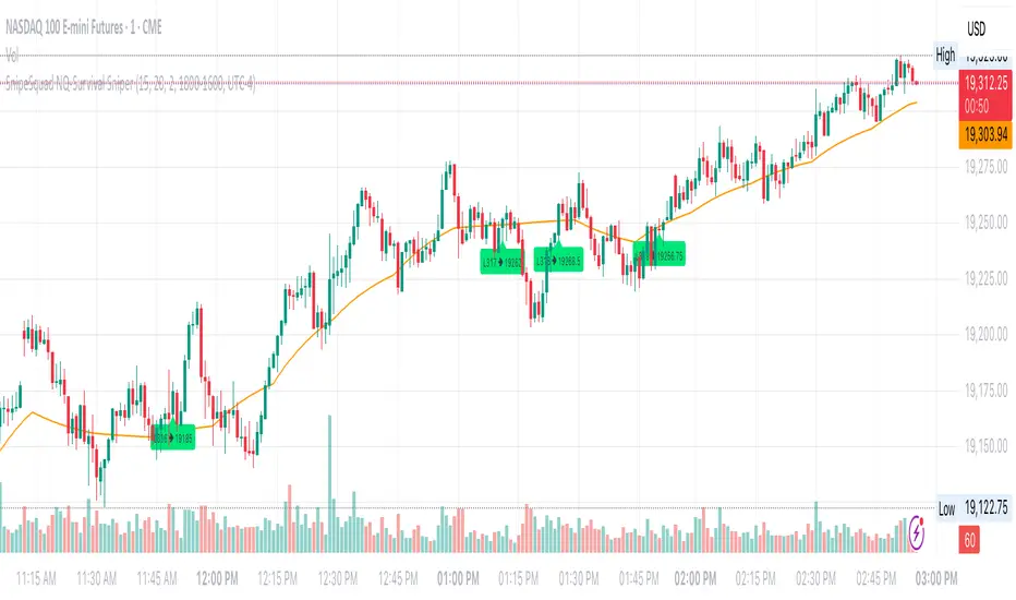Rapid-fire scalping toolkit for the 1-minute CME Nasdaq-100 futures chart (NQ/MNQ) that stacks a higher-time-frame trend bias, intraday VWAP, and momentum/RSI triggers, then auto-maps stop & target levels so $nipeSquad members can drop OCO orders in a click.