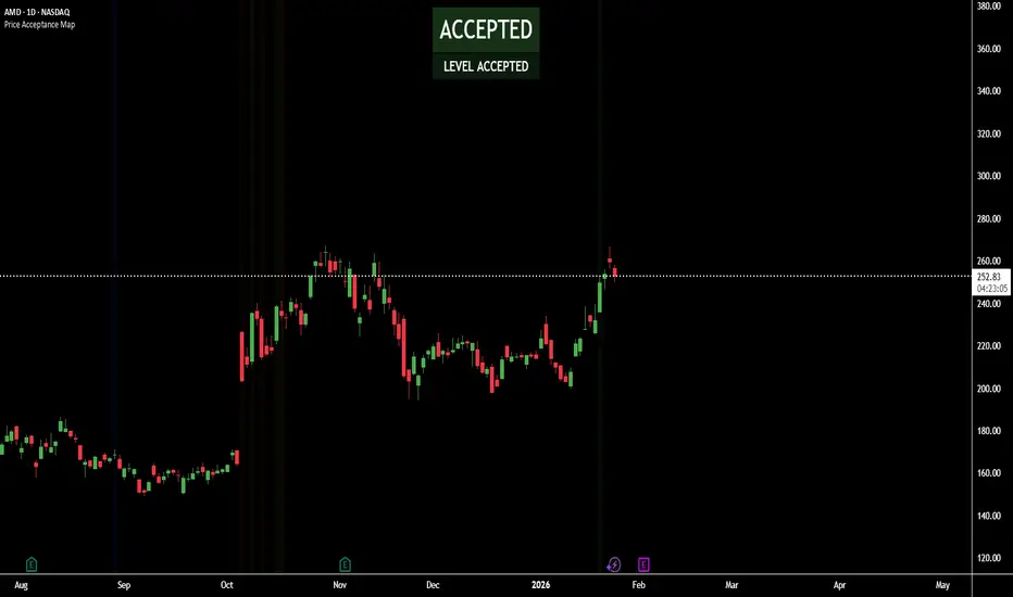 Price Acceptance Map is a read-only market context indicator that evaluates whether newly asserted price levels are being accepted, rejected, or remain undefined by subsequent market behavior.