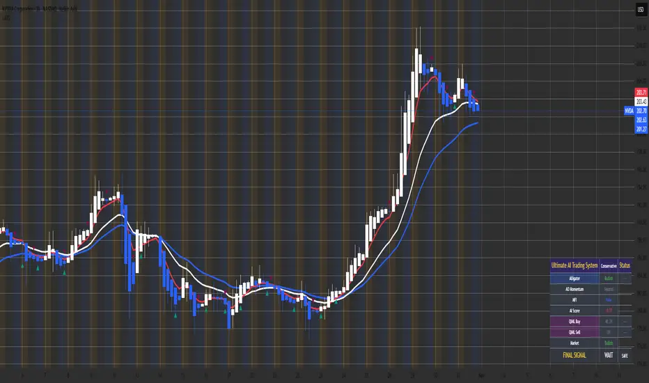 Setup: Overlay on chart. Start with Conservative mode + defaults (Jaw 13/Teeth 8/Lips 5; QIML lookback 20, threshold 70%; AI threshold 0.5). Enable MFI for volume assets; toggle ultra for rarer entries. Position dashboard as needed.