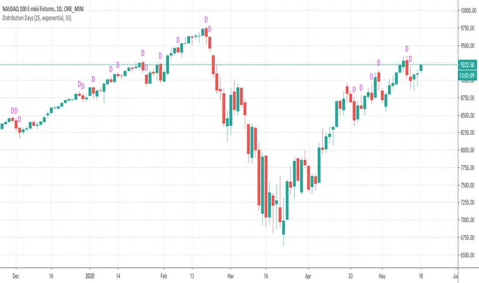 Possible inputs are "days back" to count how many trading should be examined(default: 25). Additionally, I implemented the possibility to draw a moving average (default: exponential, 50), to eliminate distribution days below, because it is more of an indicator for the upside. Perhaps a little bit too much / too complicated, therefore it is off by default.