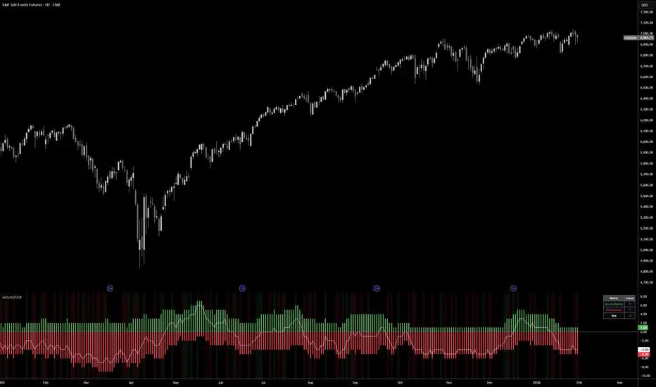 The histogram displays a rolling count of distribution and accumulation days within your chosen lookback period (default: 20 bars). Green bars show accumulation days above the zero line, while red bars show distribution days below the zero line. A white line plots the net difference (accumulation minus distribution) to show the overall balance.