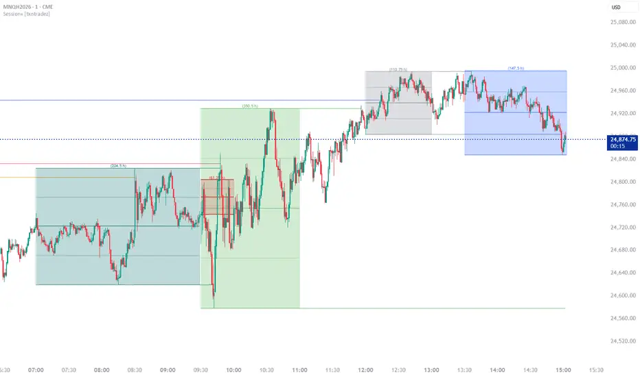 Each session automatically tracks high, low, 50% midpoint, and 25%/75% quartiles. When price sweeps a session high/low then reverses, it may signal a liquidity grab. Optional "Extend Until Breached" projects lines forward until price crosses them. Displays session range in handles/ticks for volatility assessment.