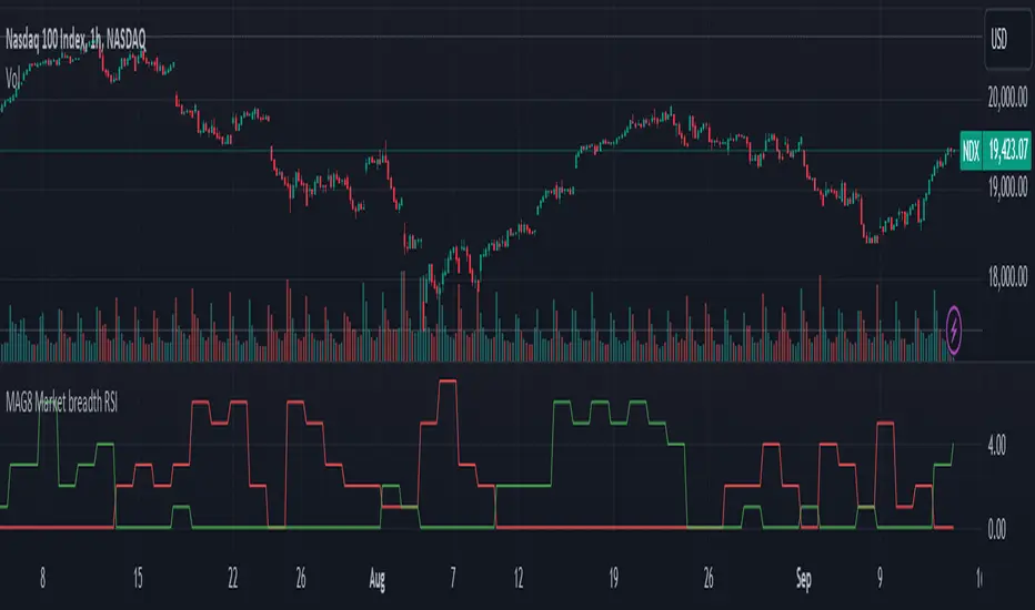 The MAG8 Market Breadth RSI Indicator is a powerful tool that tracks the RSI (Relative Strength Index) levels of eight market-influencing stocks: Meta, Amazon, Netflix, Google, Tesla, Microsoft, Apple, and Nvidia.