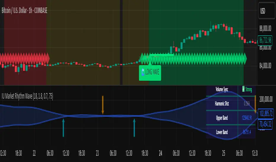 The IU Market Rhythm Wave is a multi-dimensional indicator designed to reveal the underlying rhythm and energy of the market. By analyzing price momentum, harmonic oscillations, volume behavior, and market breadth, it helps traders identify high-quality long and short wave signals. It also visualizes rhythm bands, wave strength zones, and harmonic levels to provide comprehensive context for decision-making.