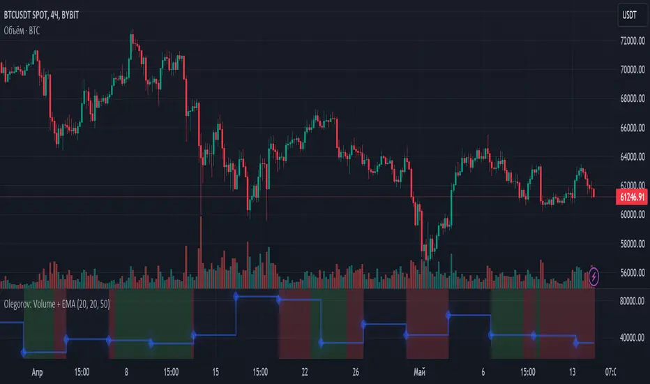 This indicator can be useful for identifying periods of high and low volume relative to the previous interval, along with the relationship between two EMAs. It can be used in various trading strategies, such as trend following or momentum trading, where volume and moving averages play important roles in decision-making. For example, traders might look for bullish signals when the current interval's volume is higher than the previous interval's volume and ema1 is above ema2, indicating potential upward momentum. Conversely, bearish signals might be considered when the current interval's volume is lower than the previous interval's volume and ema1 is below ema2, suggesting potential downward momentum.