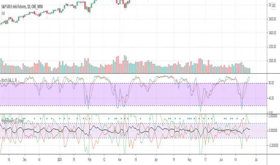 This is an indicator that compares the rate of change as a proportion to the Feigenbaum Constant (The black line). The green line is a positive divergence from the rate of change, the red is a negative divergence from the rate of change. When the Red line is on top and the green line is on the bottom, then that is a bearish trend. When the Green is on top and the red is on bottom, that is a bullish trend. The black line also helps indicate a general bullish or bearish trend based on how it moves.