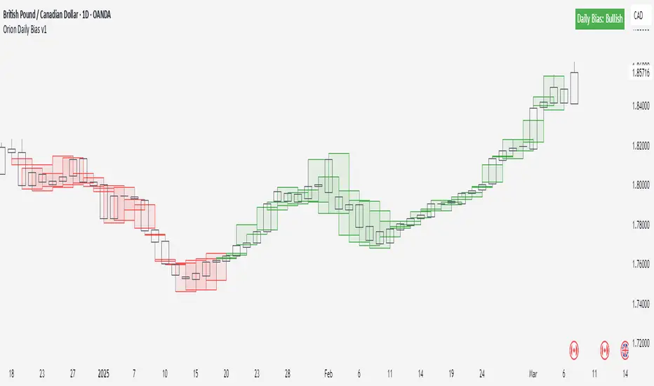 Displays "Daily Bias: Bullish" (green) or "Daily Bias: Bearish" (red) in the top-right corner of your chart.