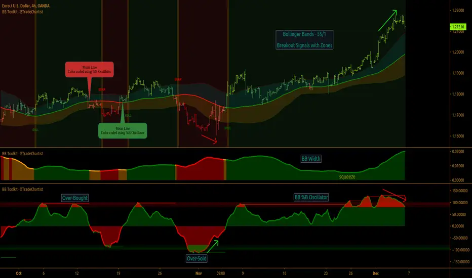 ™TradeChartist Simple Bollinger Bands Toolkit is a useful set of Bollinger Bands based utilities, which includes 0 mean %B Oscillator, price volatility based BB Width, actual Bollinger Bands and BB Breakout Signals.