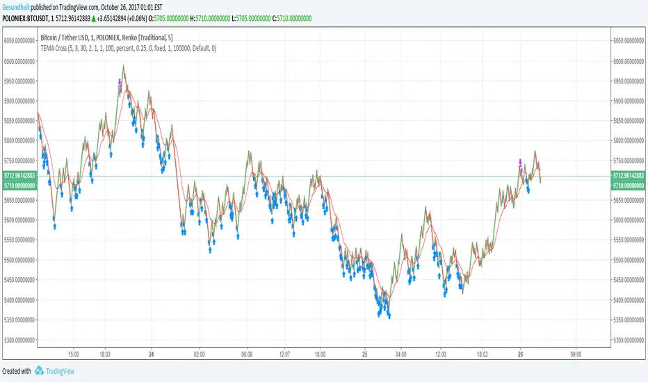 Buying and selling is simple, buy when TEMA crosses above a short-term SMA, and sell when TEMA crosses below the short-term SMA. The use of Renko candles makes these crosses more reliable, and TEMA gives us more optimal entries and exits.