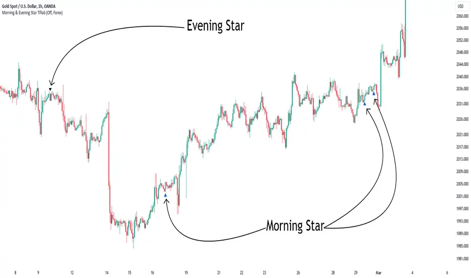 Two significant patterns in this regard are the "Morning Star" pattern and the "Evening Star" pattern, which are formed by a combination of three different candlesticks and are considered as reversal patterns.