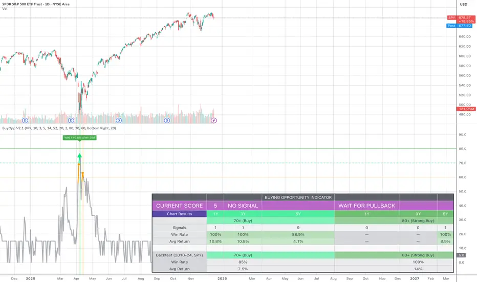 OverviewA composite scoring system (0-100) that identifies high-probability buying opportunities during market pullbacks. Validated through backtesting on SPY from 2010-2024.