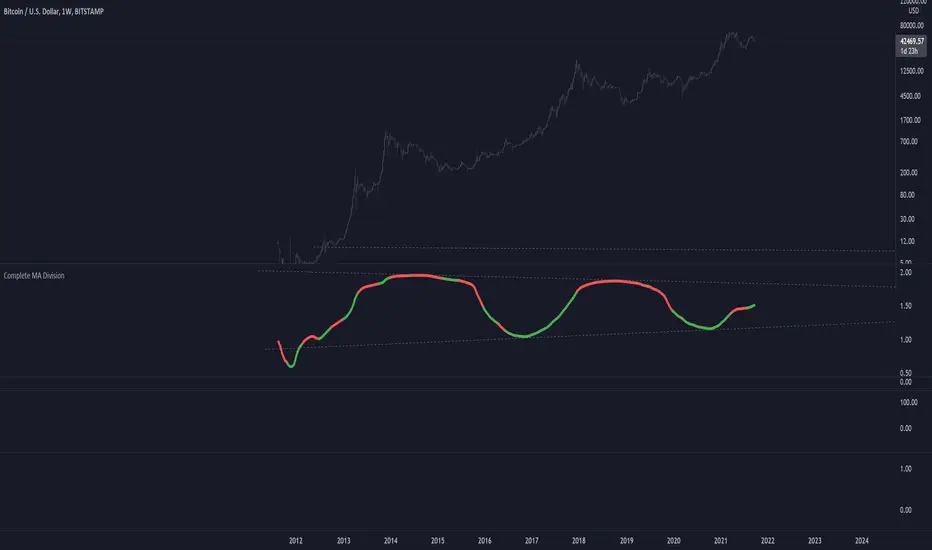 This indicator simply divides two moving averages and calculates the slope of the resulting curve to show when an asset's momentum is slowing down. The original idea was in a recent youtube video by Ben Cowen . His indicator didn't show the complete history of the moving average, so I wanted to try a little trick to get the moving averages at the beginning of time even when using a large moving average period. I accomplished this by counting the number off current bars using the cum() function. After the count is hit, the period will be constant.