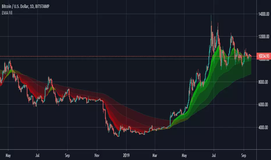 Enter any two EMAs under input and the indicator will fill the space between those two EMAs. If the EMAs have a bullish cross, the fill will be green. If the EMAs have a bear cross, the fill will be red.