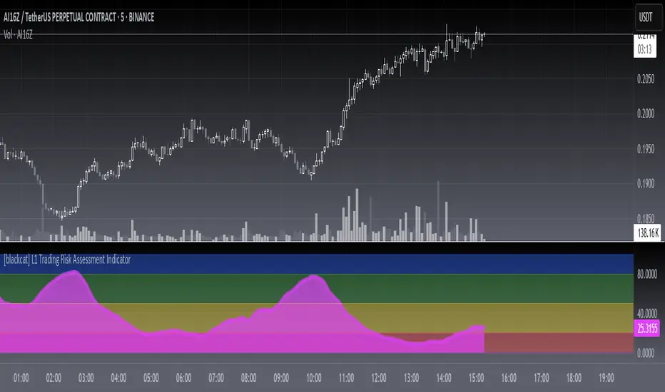█ OVERVIEWThe [blackcat] L1 Trading Risk Assessment Indicator provides traders with a visual representation of market conditions, helping them gauge the current risk associated with their trades based on price action data. The indicator calculates a risk score ranging from 0 to 100, where lower scores indicate higher levels of safety and vice versa.