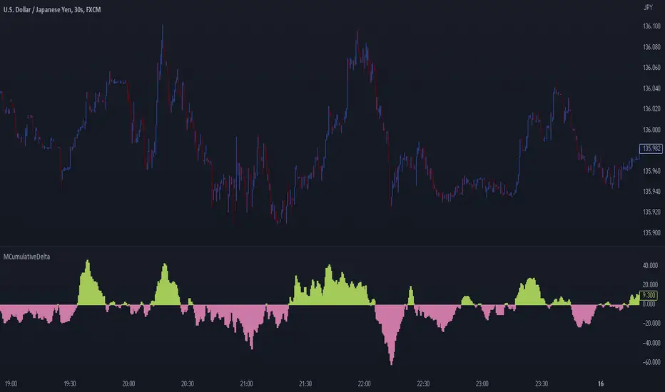 Unlike other Cumulative Delta indicators which determine delta from the Up / Down wick and just multiply by volume (not a true delta), the MCumulativeDelta indicator uses a sophisticated algorithm that analyzes price movement corresponding to volume movement.
