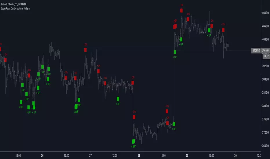 SuperRadu Candle Volume System detects all impulses larger than you specify in the inputs, by default it's 500 BTC, so as you can see above it detects all significant impulses this helps you to make better decisions while you trade.