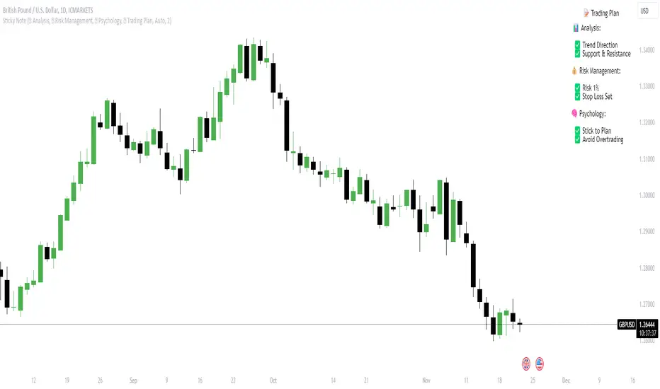 Stay organized and disciplined with this customizable sticky note on your TradingView chart. Perfect for traders who want to keep essential trading reminders, checklists, or notes visible while analyzing the market.