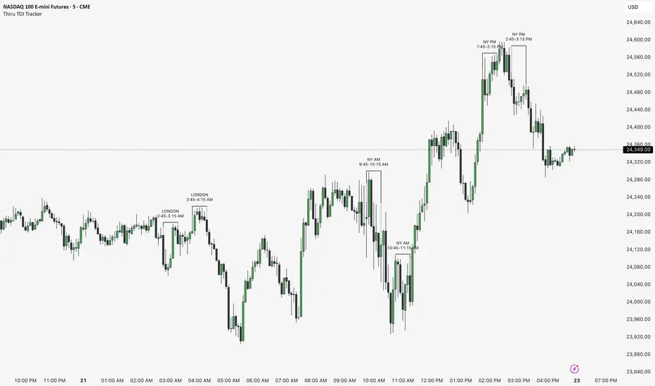 Thiru TOI Tracker identifies critical Time-of-Interest (TOI) windows during major trading sessions. This proprietary indicator automatically marks key institutional trading times with dynamic line extensions that adapt to price action, helping traders identify optimal entry and exit points.