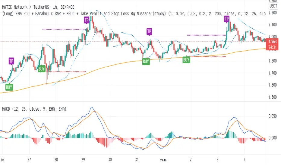 Telah dikemas kini (Long) EMA 200 + Parabolic SAR + MACD + TP&SL By Nussara (study)