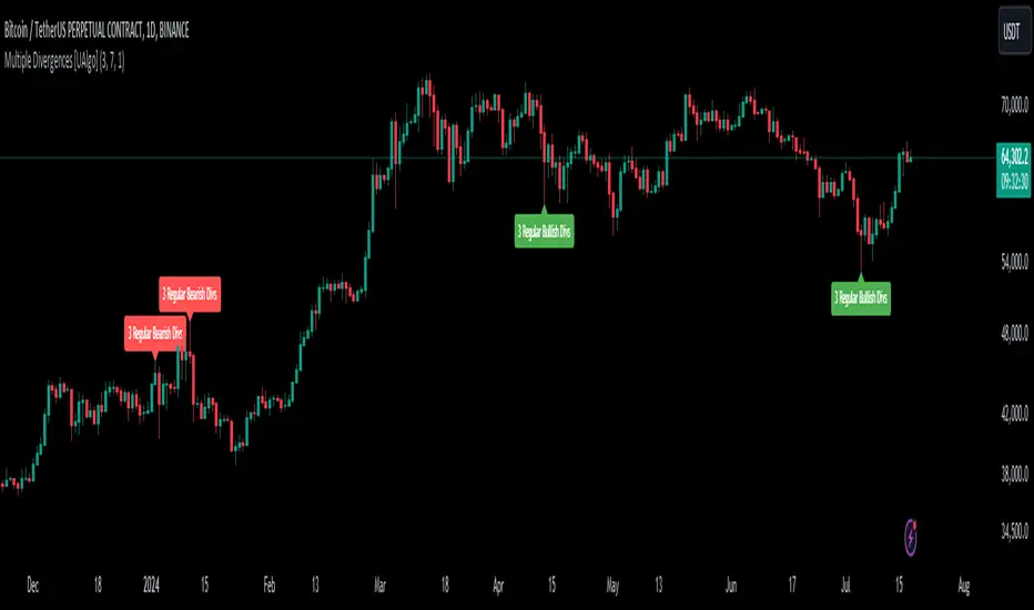 "Multiple Divergences [UAlgo]" is providing insights into potential divergences across multiple indicators. Divergence, a concept in technical analysis, occurs when the price of an asset diverges from the direction of an accompanying indicator, suggesting a possible reversal or continuation in the price trend.