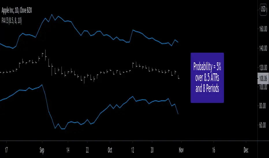 PAI is an indicator I created that tells you the probability of current price moving a specified ATR distance over a specified number of periods into the future. It takes into account 4 variables: the ATR & the standard deviation of price, and the 2 parameters: ATR distance and # bars (time).